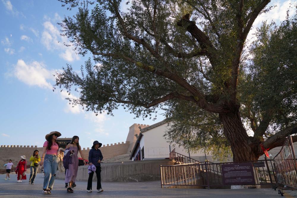 7月14日,游览嘉峪关关城的游客从“左公杨”下经过。这株杨树是百余年前左宗棠率军途中栽种的,有诗赞曰:“新栽杨柳三千里,引得春风度玉关”。新华社记者 马宁 摄 在关城南侧,长城穿行数公里后直抵祁连山雪水化成的讨赖河,尽头矗立着明代长城最西端的第一座墩台,故名“长城第一墩”。