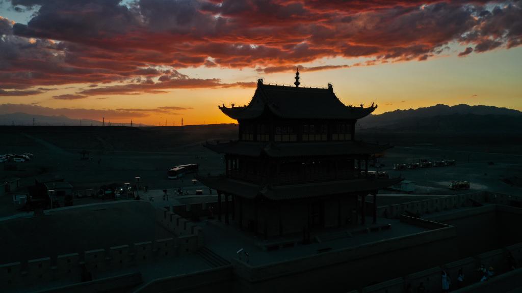 8月16日拍摄的火烧云与嘉峪关关城(无人机照片)。新华社记者 郎兵兵 摄