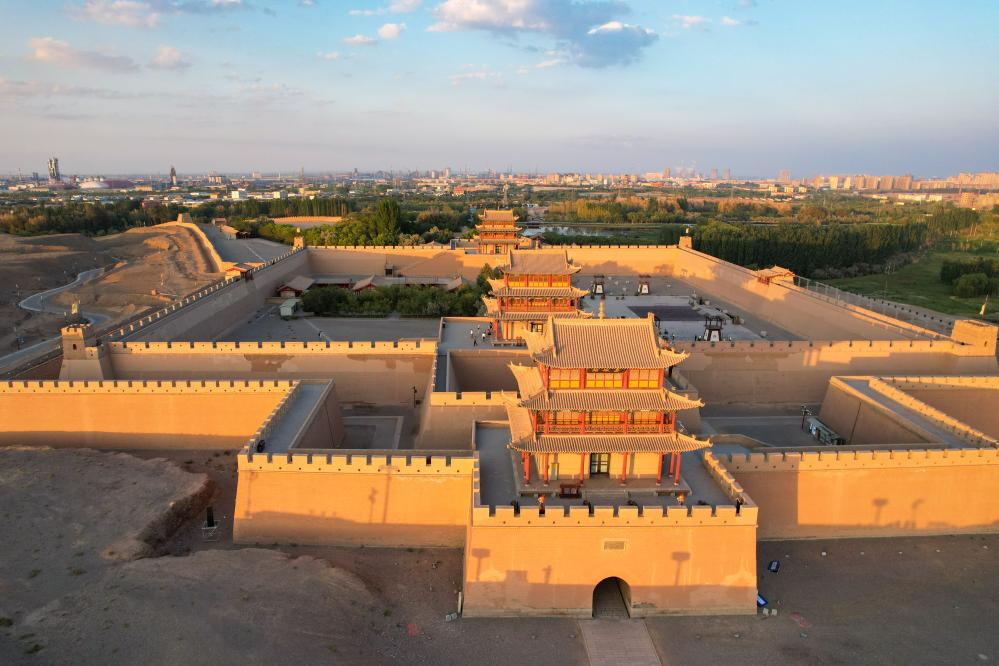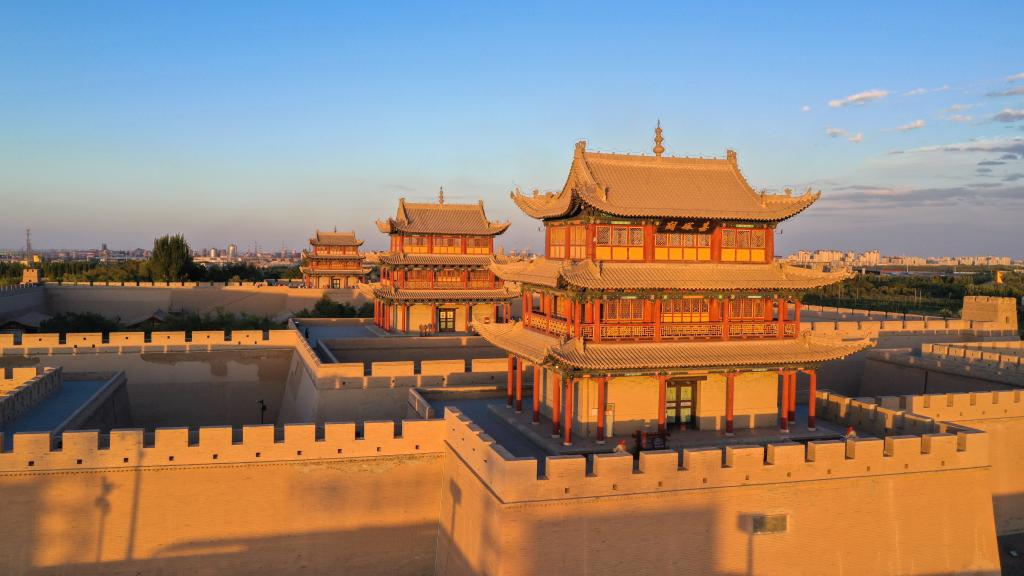7月15日拍摄的夕阳下的嘉峪关关城(无人机照片)。新华社记者 郎兵兵 摄
