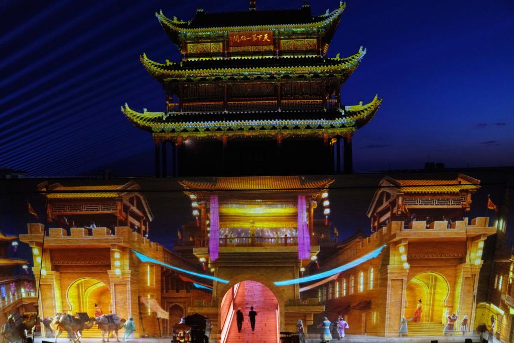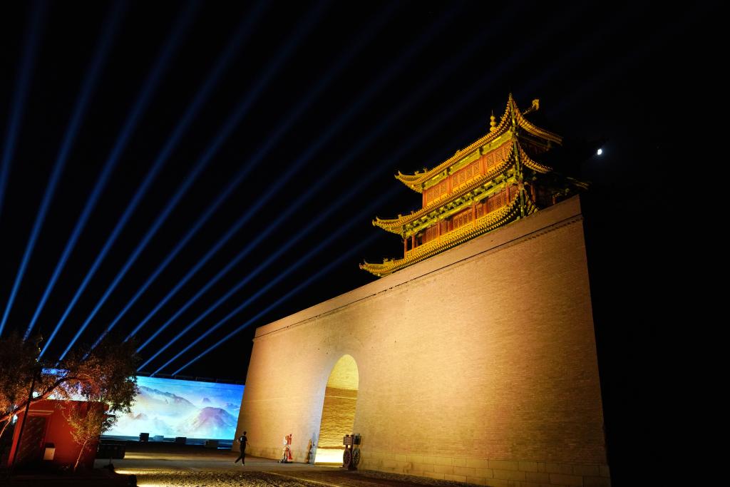 7月14日,工作人员在嘉峪关关城测试夜游光影效果。新华社记者 马宁 摄