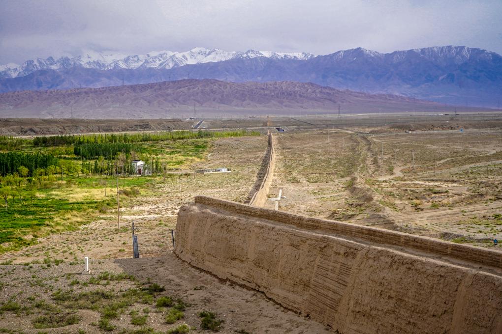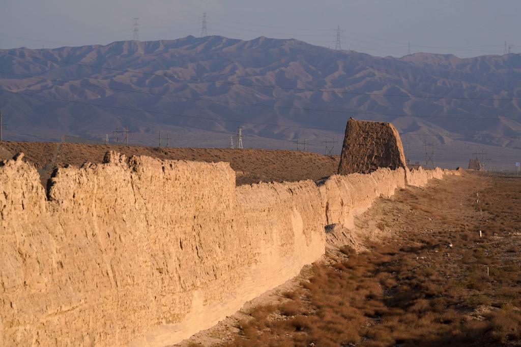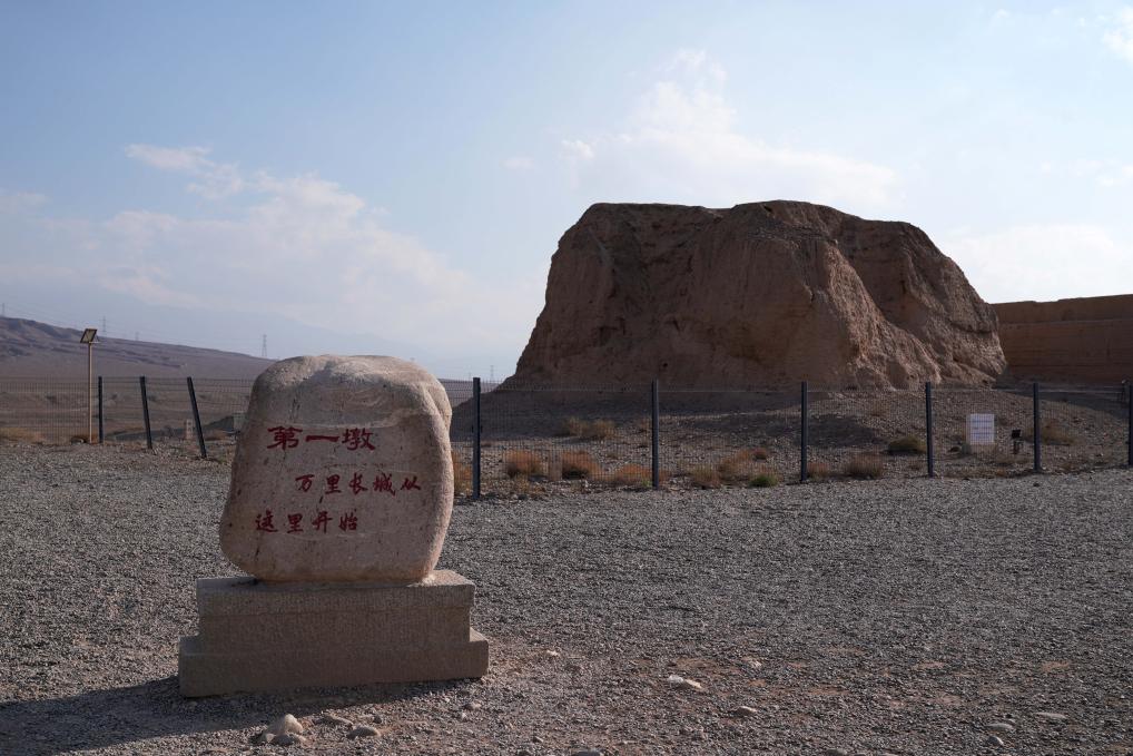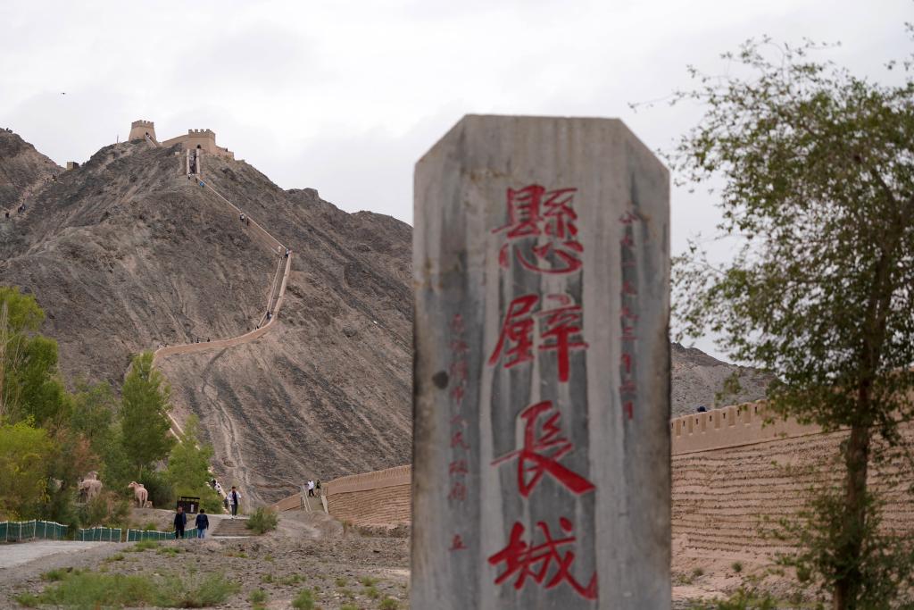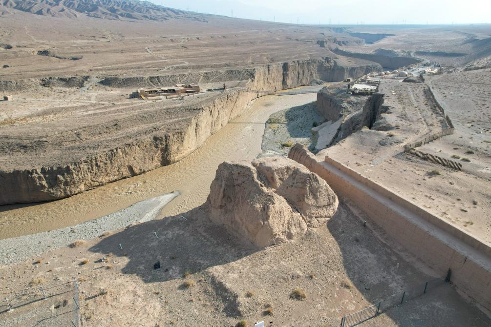 7月14日拍摄的讨赖河边的“长城第一墩”,这是明长城的西端起点。新华社记者 马宁 摄 关城北侧的长城蜿蜒抵达黑山脚下的石关峡口后一分为二,沿南、北两侧山脊顺势而上,因山势险峻,得名“悬壁长城”。