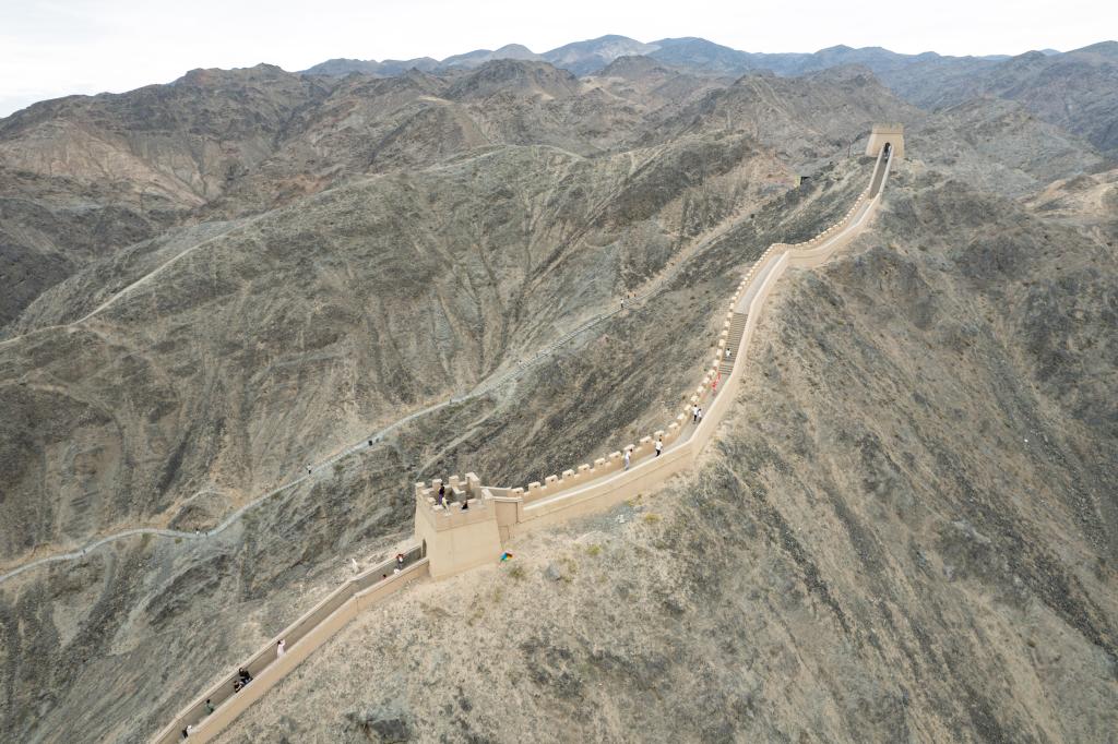 7月15日,游客在游览悬壁长城(无人机照片)。新华社记者 郎兵兵 摄 已有650余年历史的嘉峪关,先后被公布为全国首批重点文物保护单位、世界文化遗产地、全国首批5A级旅游景区,每年吸引数百万游客前来感受其独特的长城文化、丝路文化和边塞文化。
