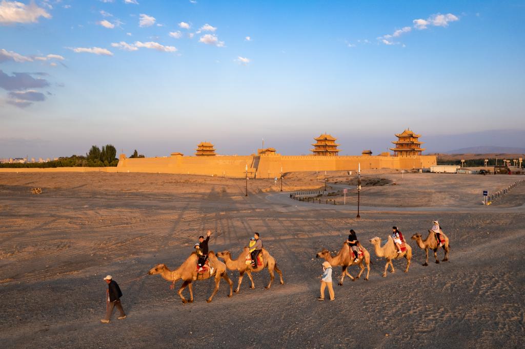 7月15日,游客在嘉峪关关城旁骑骆驼游览(无人机照片)。新华社记者 郎兵兵 摄