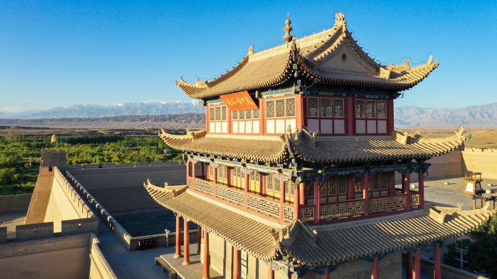 8月16日拍摄的嘉峪关光化门门楼和远处的祁连雪山(无人机照片)。新华社记者 郎兵兵 摄