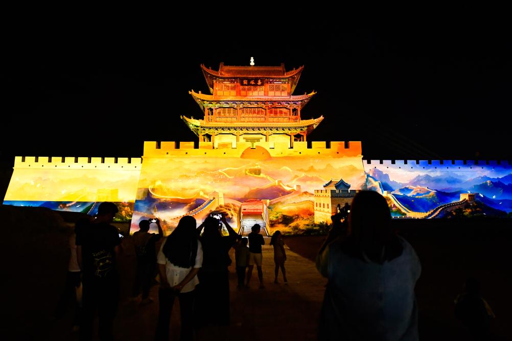8月16日,夜游嘉峪关关城的游客在拍摄灯光秀。新华社记者 郎兵兵 摄