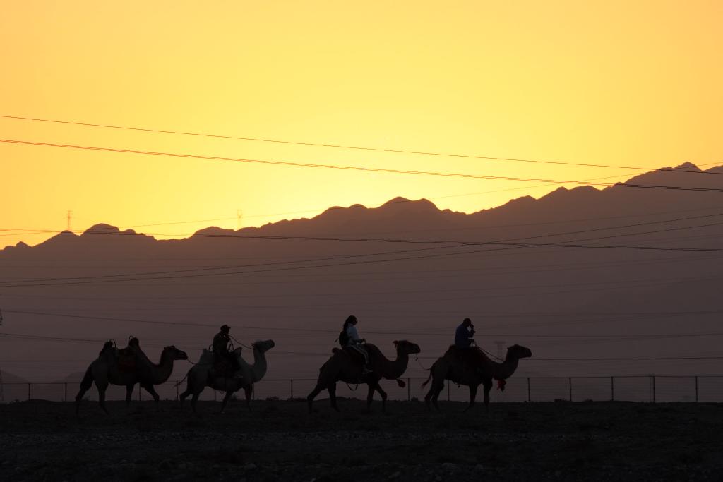7月14日,夕阳下山时分,驼队从嘉峪关关城外走过。新华社记者 马宁 摄 今年暑期,嘉峪关关城全面开启夜游模式,通过激光投影、数字科技、舞台实景演艺等多元形式,让“天下第一雄关”在光影交织中焕发新活力。