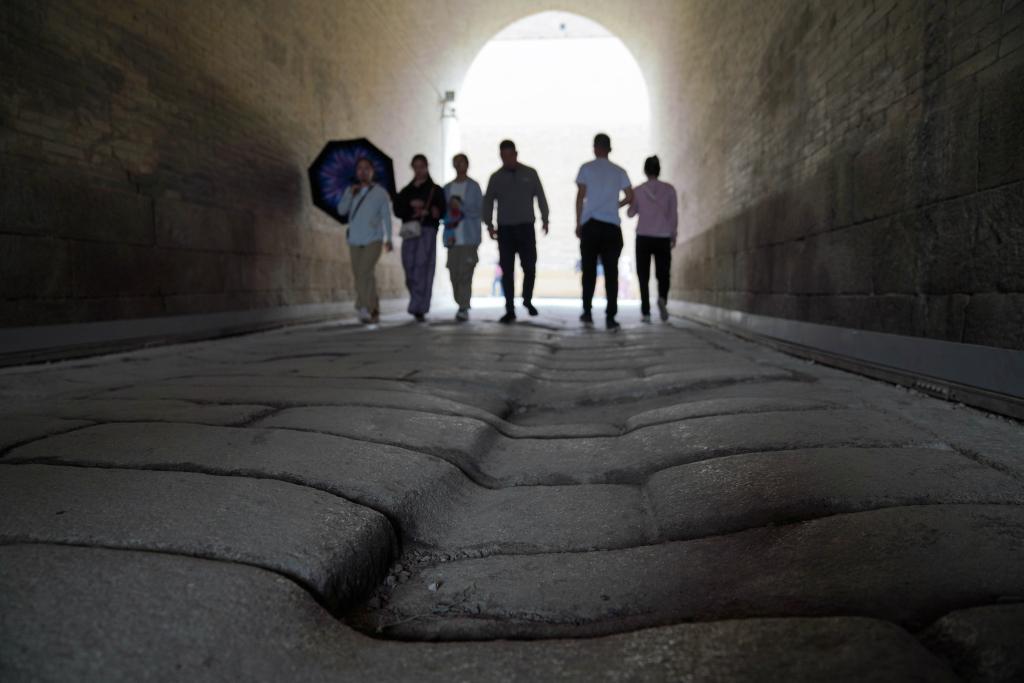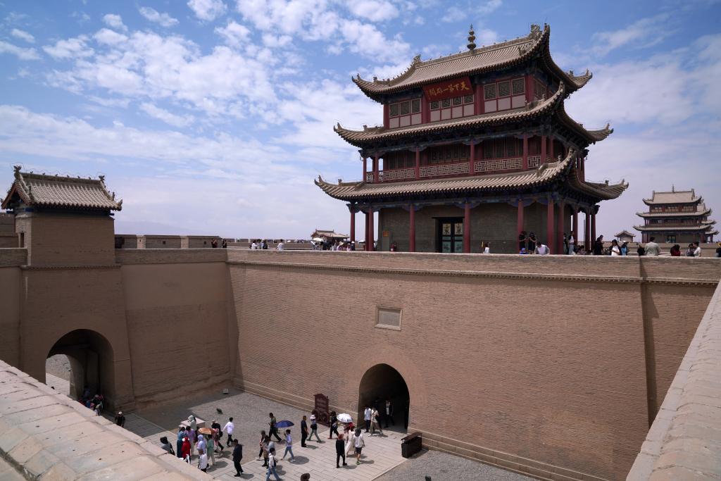 7月14日,游客在嘉峪关关城游览。城门下的地面,在车轮的长期碾压下形成明显的车辙。新华社记者 马宁 摄 历经百年营建,嘉峪关形成了居中的关城与南北两翼长城相互守望的严密军事防御体系。关城由内城、外城、瓮城、城壕等组成,是一座城内有城、层层设防的坚固堡垒。走出关城最西侧的嘉峪关门,便是茫茫大漠戈壁。晚清名臣林则徐路过嘉峪关时曾赋诗赞叹:“严关百尺界天西,万里征人驻马蹄。”“除是卢龙山海险,东南谁比此关雄。”