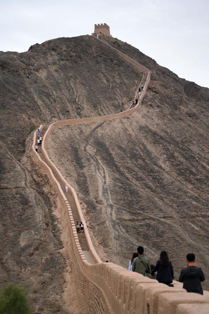7月14日,游客在游览悬壁长城。新华社记者 马宁 摄