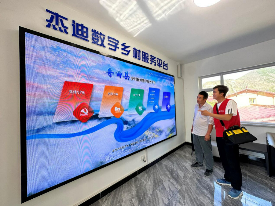 电信工作人员正在教村干部使用数字乡村平台。 于洁 摄