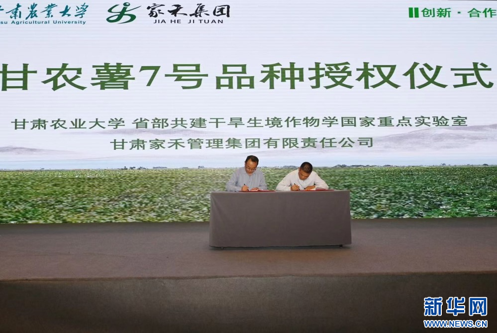 推进会上,来自全国各地的客户和商家现场签约,甘肃农业大学和甘肃家禾管理集团有限责任公司签订了“甘农薯7号”品种授权协议。