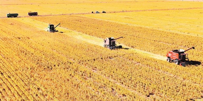 近日,高台县黑泉镇九坝滩高台农投12000多亩谷子喜获丰收,大型收割机穿梭田间进行收割。新甘肃·甘肃日报通讯员 王将
