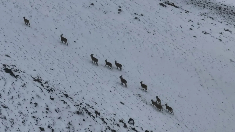 记者用无人机拍摄到国家二级保护动物岩羊在雪山“对决”的画面。
