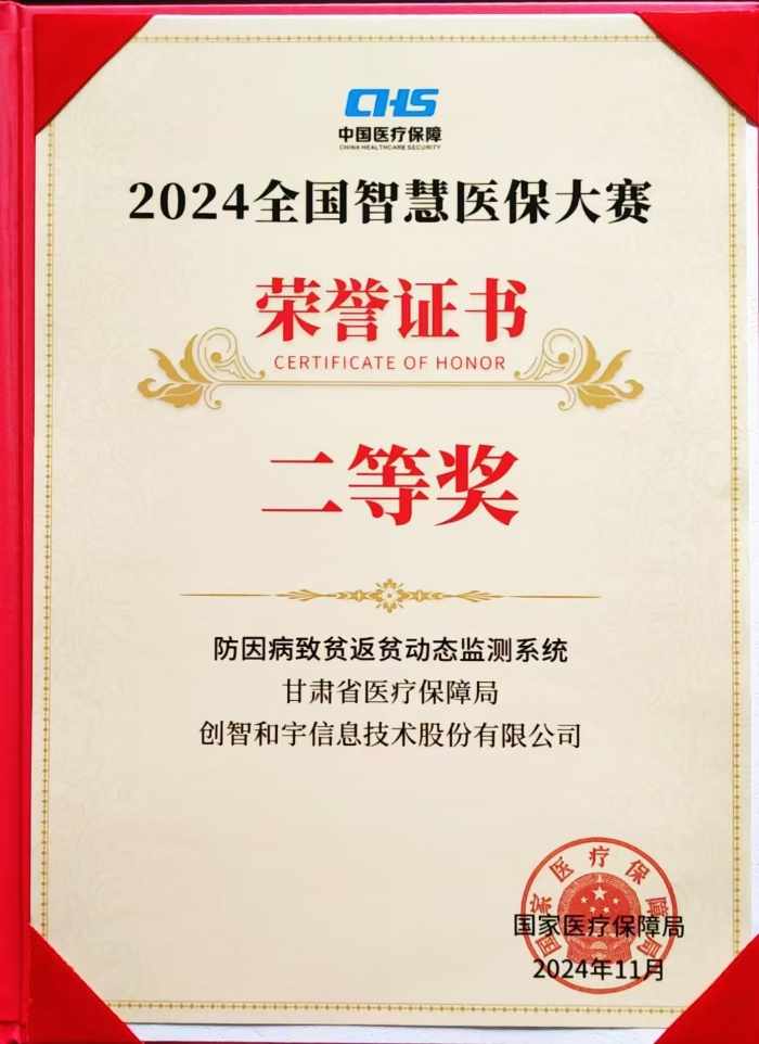 近日,由国家医保局主办的2024年全国智慧医保大赛决赛落幕,并于11月5日举办颁奖典礼,甘肃省医保局报送的《防因病致贫返贫动态监测系统》智慧医保案例历经初赛、复赛和决赛层层选拔、激烈角逐,荣获全国智慧医保大赛二等奖。