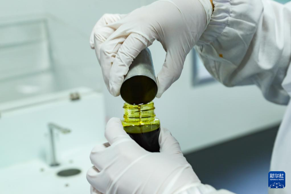 11月21日,在甘肃陇南经济开发区一家生物科技企业实验室,工作人员将花椒油产品倒入容器。新华社记者 郎兵兵 摄