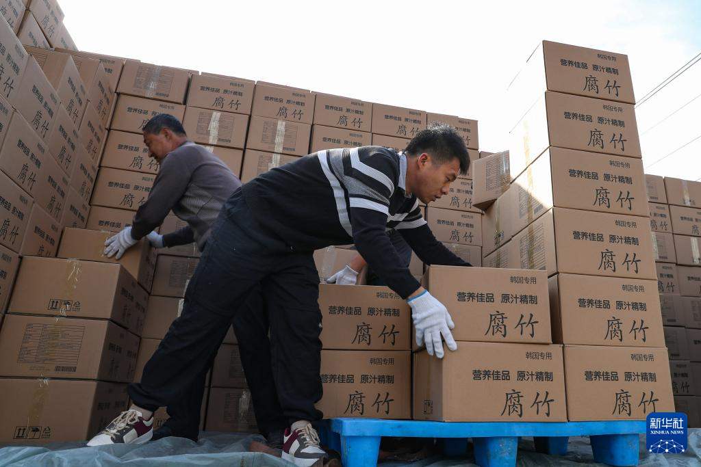 11月21日,在甘肃陇南经济开发区一家豆制品企业厂区,工人将发往韩国的腐竹装车。该企业生产的豆制品出口美国、泰国、澳大利亚等20多个国家。新华社记者 郎兵兵 摄