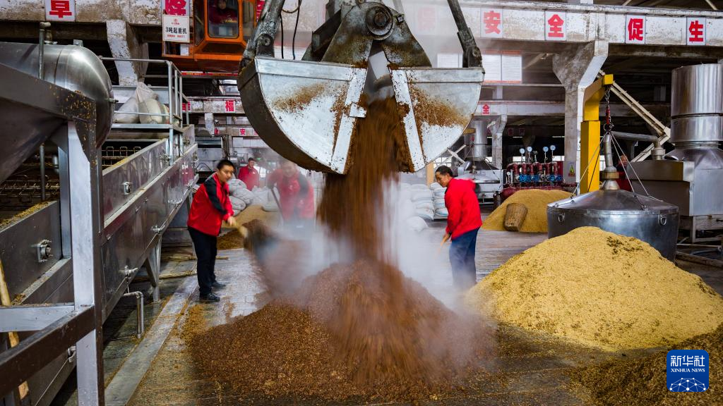 11月21日,在甘肃陇南经济开发区一家白酒企业厂区,工人按照传统技艺酿造白酒(无人机照片)。新华社记者 郎兵兵 摄