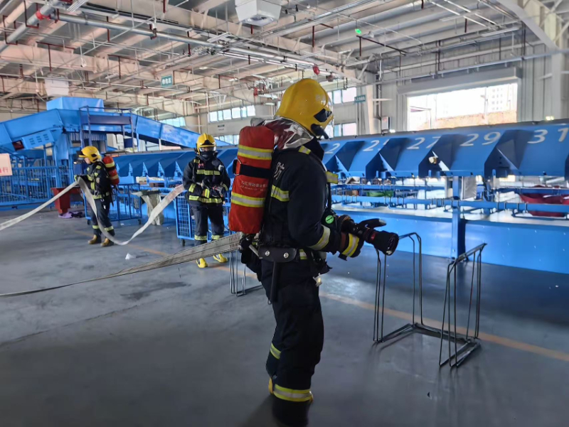 活动最后,消防大队指战员现场指导配合分拣中心开展突发火灾应急处置演练,通过模拟火情、初期扑救、应急疏散、联合救援等演练环节的抢险处置,进一步提高邮政快递从业人员的应急救援技能和综合反应素质。