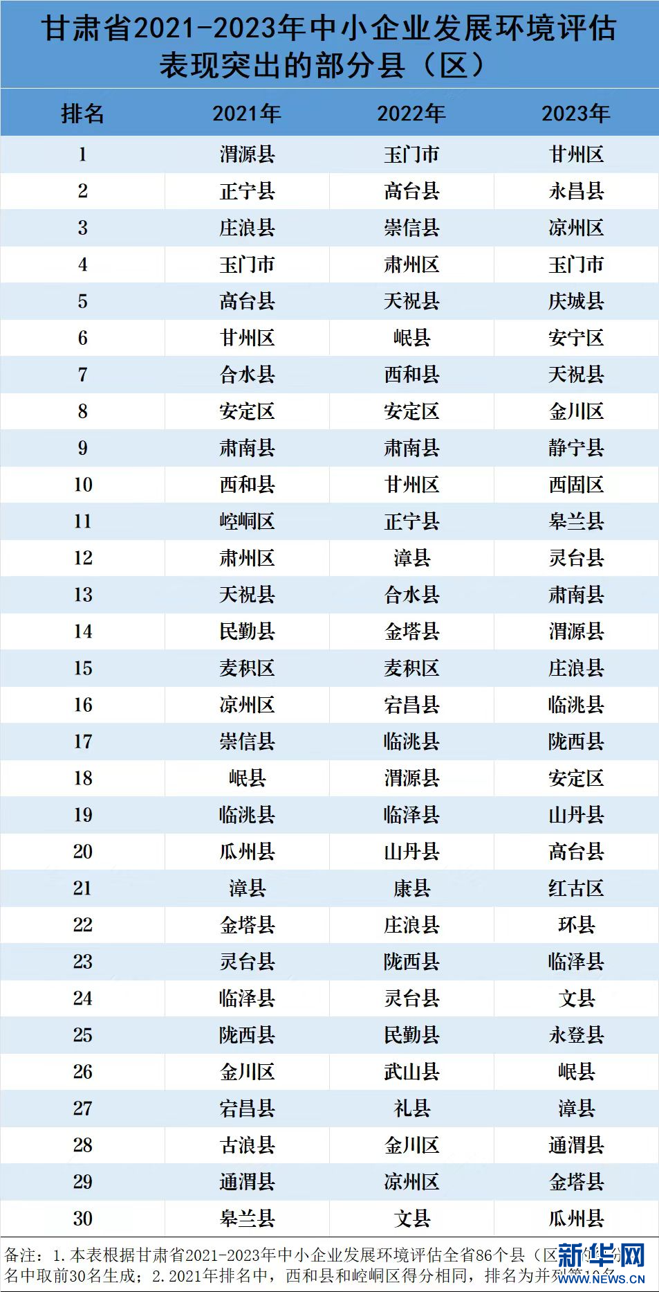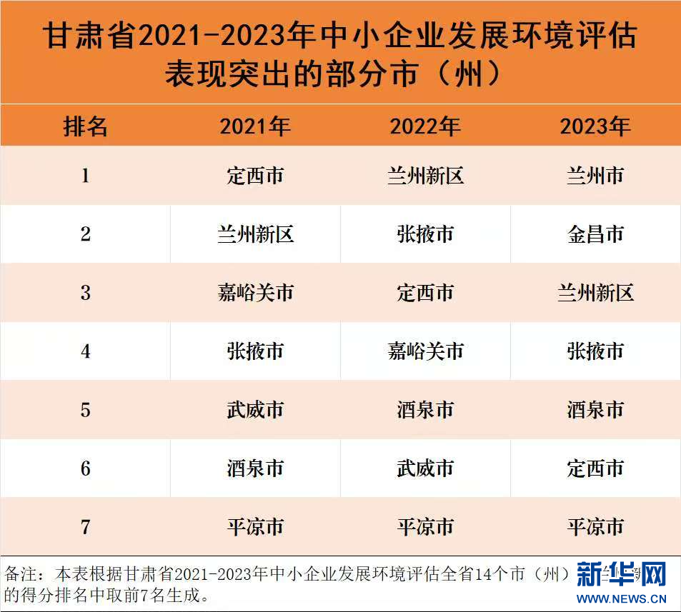 新华网兰州12月5日电(记者张新新)近日,兰州大学发布了2021至2023年度《甘肃省中小企业发展环境评估项目》评估成果,报告显示2021至2023年甘肃省各市(州)、县(区)和兰州新区的中小企业发展环境评估综合得分呈逐年上升态势,全省各地区中小企业发展环境持续改善优化,全省优化营商环境工作取得初步成效。