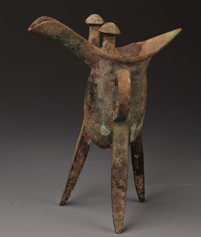 商代晚期的“鸟祖癸”青铜爵,出土于庆阳市西峰区温泉乡韩家滩庙嘴村。此爵腹微鼓,圆底,棱形三尖足稍外侈,菌状柱靠近流侧。腹一侧有扁条卷成的半环鋬,鋬下镌刻“鸟祖癸”三字。爵腹以云雷纹作地,上饰饕餮纹,饕餮纹上下两端以连珠纹镶边。此爵造型精美,纹饰繁复,是商代晚期青铜酒器的佳作。