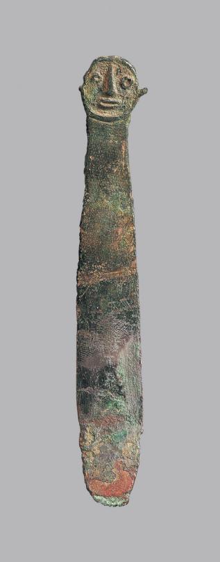 人面柄首铜匕属于辛店文化(距今2400一2800年前),采集于甘肃省广河县,现藏甘肃省博物馆。匕长14.3厘米,宽2.2厘米。匕柄扁平呈长条状,中间略鼓,下端为圆弧形。背部有条形纽。匕首铸一圆形人面,圆脸,双目圆睁,鼻子长挺呈三角形,双唇略厚,撮起微开,双耳外张,轮廓分明。人头形与匕相结合,是早期青铜匕中的独特器型。