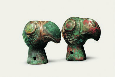 春秋战国时期的鹰头形青铜权杖首,出土于永登县榆树沟沙井文化遗址,器高5.5厘米,宽5.2厘米。圆眼,尖喙。鹰是匈奴等游牧民族崇拜的猛禽,十分威猛。青铜鹰首为轴杆类顶端的饰物,部族首领手执杆头有鹰首的器物以象征权威和神圣。