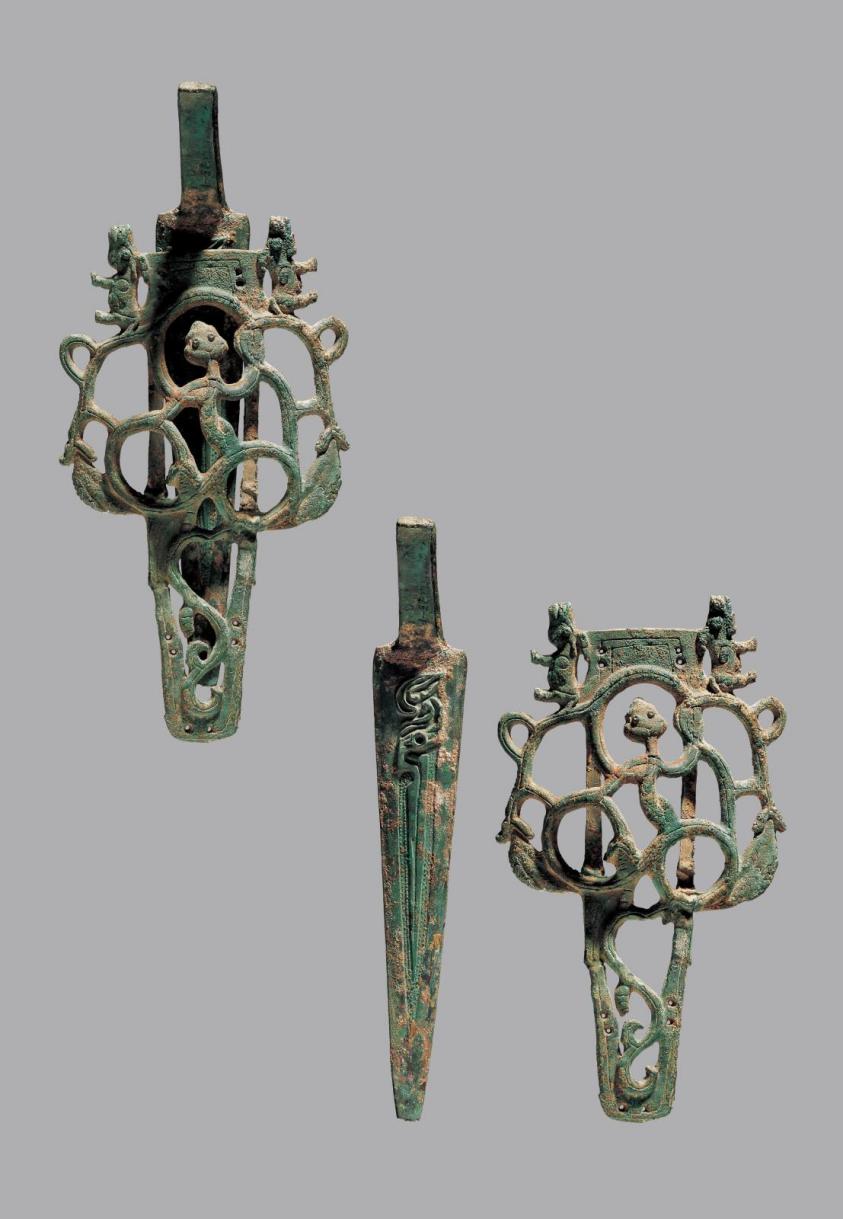 西周时期的镂空鞘青铜短剑,出土于灵台县白草坡。此剑通长24.3厘米,鞘长18.7厘米,宽10.5厘米。鞘以回环缠绕的镂空蟠蛇纹构成,蛇身上有阴刻浅槽,钝三角形蛇头,双目凸起。鞘口两侧各有小犀牛一只,形象生动。剑茎平直,剑身若韭叶形,剑身脊铸窃曲纹。
