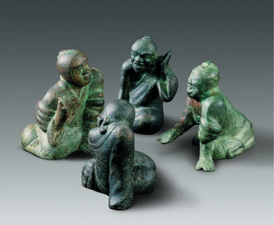 西汉的铜博戏俑,出土于灵台县。俑最高9.2厘米,最宽9.7厘米。四俑相向跪坐,身着汉代最常见的高领衣服。二人头顶盘挽发髻,二人以宽巾裹首。坐姿不同,形态各异,有的前倾仰首,有的垂臂塌肩;有的袒胸露膊,似在伸手探取;有的屈腿斜身,默然扶膝静待。最为精彩有趣的是四俑的面部表情,独具匠心,刻画细腻,他们或喜笑颜开,或怒不可遏,或凝神沉思,或忧伤悲愁。铜博戏俑具有极强的艺术感染力。