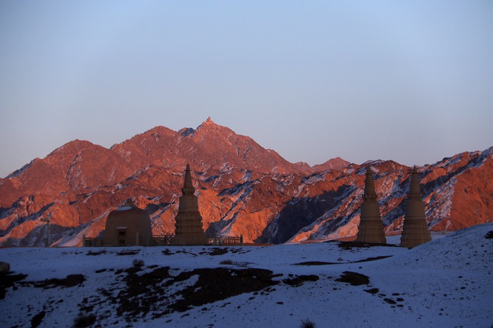 12月13日,在夕阳的映照下,为敦煌市当地著名景点三危山披上了一层金色,美不胜收。