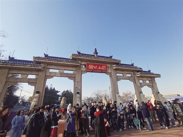 游客在兰山公园半山门牌坊处打卡