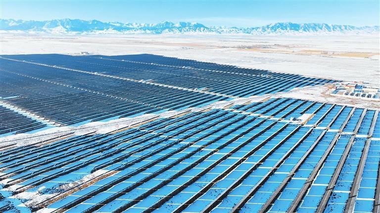 冬日的民乐三墩滩10万千瓦光伏电站一排排光伏太阳能发电板整齐排列,如同蓝色的海洋。新甘肃·甘肃日报通讯员 王晓泾