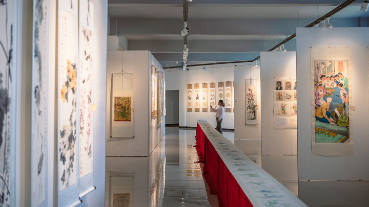 游客在定西市通渭县悦心国际书画村观赏书画作品。