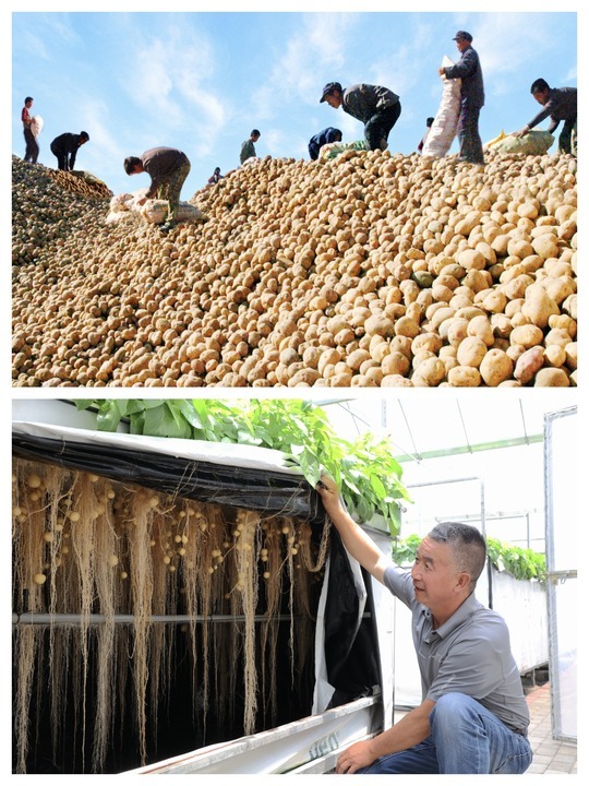 拼版照片:上图为上世纪90年代定西市安定区马铃薯丰收的场景,下图为定西马铃薯研究所繁育的马铃薯种薯。(定西市委宣传部供图)