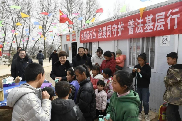 2024年2月19日,省委政法委和省检察院组织开展“法润积石山 检爱同守护”普法基层行活动。图为政法干警赴积石山县大河家镇韩陕家村十社安置点开展普法宣传。