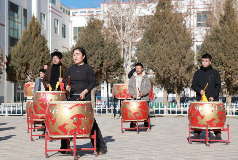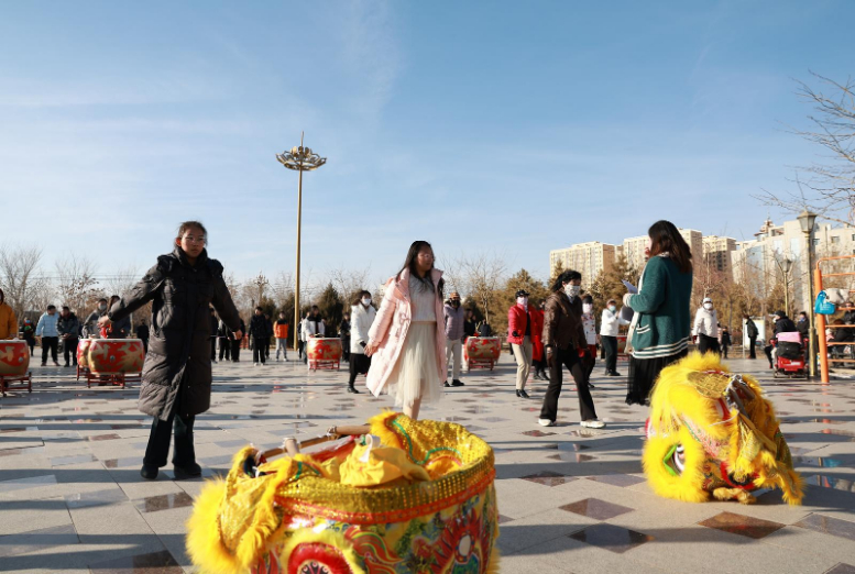 在航天公园,金塔县羊井子湾乡太平鼓表演队排练正酣,队员们个个热情高涨、精神抖擞、神采飞扬,伴随着欢快的鼓点、铿锵的锣鼓声,或走或跳,一招一式无不饱含着对新年美好生活的憧憬和向往。