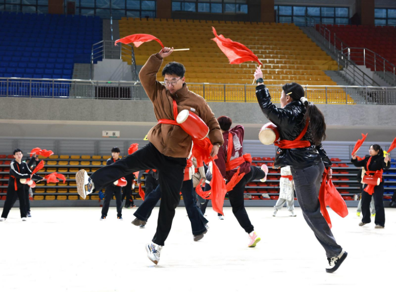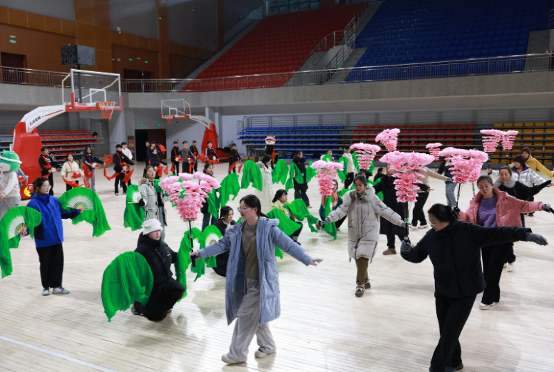 在体育馆,各个社区的社火队员们正热情高涨、精神抖擞的进行社火排练。秧歌队、腰鼓队在总指挥的指导下,打腰鼓、舞扇子、绕花子、踏鼓点,一举手、一投足反复练习着队形的变换、掌握动作要领和舞步。大家踏着欢快的鼓点,伴着优美的曲调,彩扇、绸缎仿佛被注入灵魂一般,在他们的手中翻飞起舞,一招一式无不展现出社区人民昂扬向上的精神风貌。