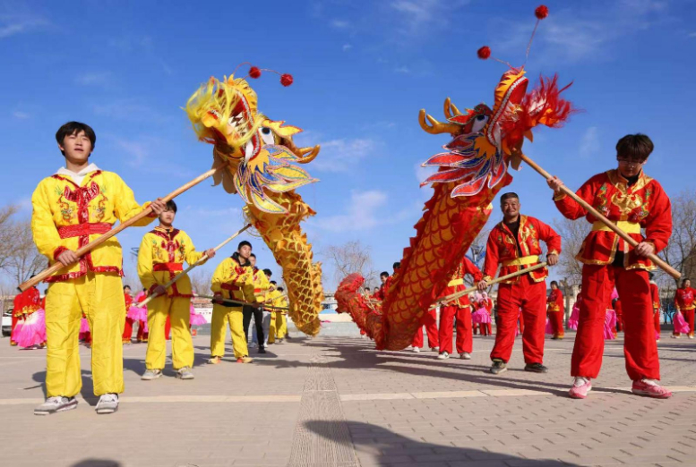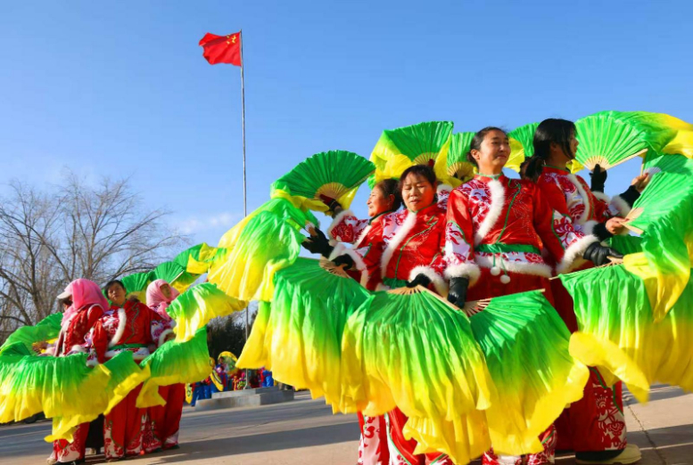 “来来来,大家动起来,我们秧歌队的姐妹们,动作一定要做到位、做标准……”社火秧歌队领队魏巧玲和演员们热情高涨,踏着鼓点、伴着旋律,反复练习队形变换和动作要领。近日,在金川区双湾镇龙口村文化活动中心的小广场上,晴空如洗,一片瓦蓝,五星红旗在蓝天的映衬下显得格外鲜艳。身着节日盛装的村民们在铿锵的鼓声中精神抖擞,或飞舞彩扇,或龙腾虎跃,现场热闹非凡。