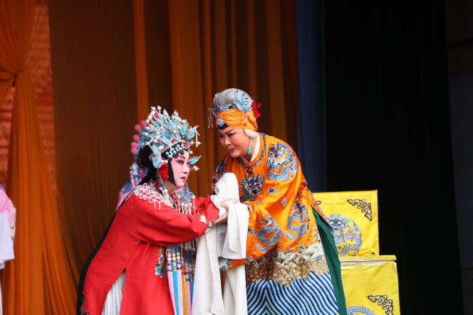 一阵激昂的锣鼓声响起,演员们身着精美的戏服盛装登场,绚丽多彩的服饰、精致考究的盔头,瞬间将观众带入了那个权谋与忠义交织斗争的戏曲世界。随着剧情的深入,当皇后与皇兄你一句我一句开始“骂战”时,现场气氛热烈,叫好声不断。“他们唱得非常有感染力,听起来很入戏,很感动。”游客张雯雯不停鼓掌叫好。