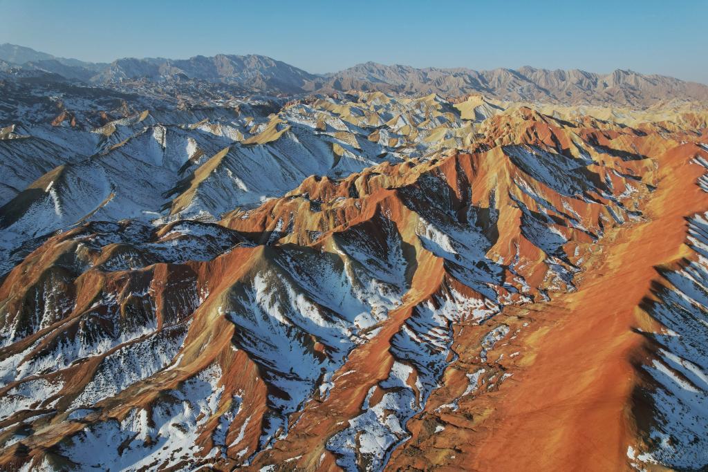 雪后的张掖七彩丹霞旅游景区(无人机照片)。新华社记者 张睿 摄
