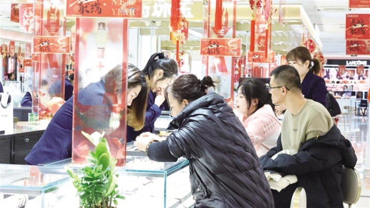 “春节期间商场有打折活动,我和男友提前选购结婚用饰品,希望买到心仪首饰,为新一年的生活讨个好彩头。”市民张婷说。