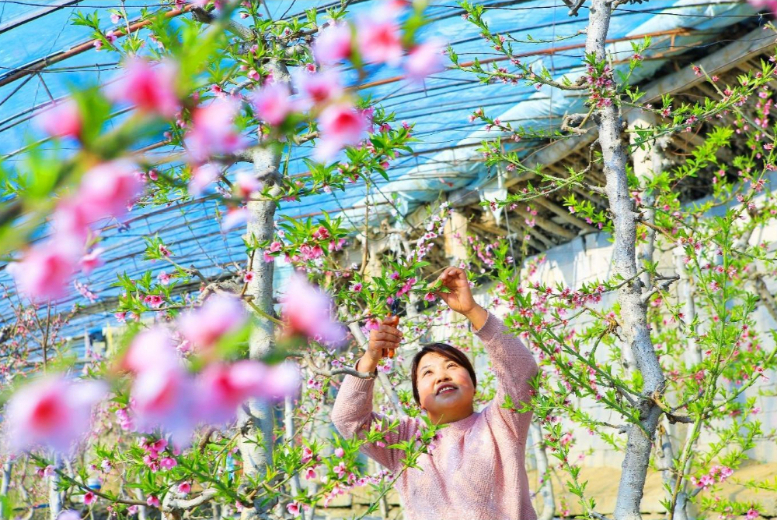 2月9日,文殊镇冯家沟村果蔬种植基地日光温室里春意盎然,油桃、蟠桃、毛桃、黄桃花卉竞相绽放,农户抢抓农时开展人工授粉、疏花、修剪作业,春日的日光温室里蝶蜂飞舞、花香四溢,一派人勤春早的繁忙景象。葫芦河 摄