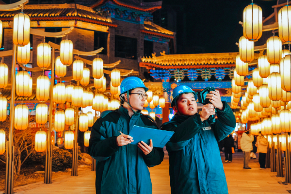 2月11日傍晚,国网兰州供电公司七里河供电分公司员工赵丞、陈玉海来到兰州老街巡检元宵灯会夜间相关用电设备及线路。
