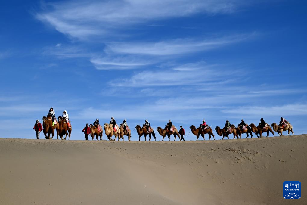 2025年2月4日,游客在敦煌鸣沙山月牙泉景区骑骆驼游览。新华社发(张晓亮摄)