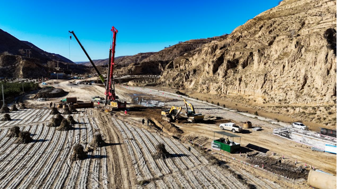 在洪德镇龚家堡子大桥项目施工现场,冲击钻发出轰鸣声,钻头在冲击力的推动下,深深扎入土层,每一次冲击都激起一阵泥浆飞溅。各岗位施工人员分工协作进行路基清表、钢筋笼绑扎、桩基施工等工序。据甘肃恒通路桥工程有限公司华二项目部工区长杨福茂介绍,该标段桥梁4-2桩基桩长17米,桩径1.4米,共涉及432根,截至目前已完成桩基施工70根,便道累计施工完成24公里。“项目部安全、质量、环保等各项措施均已到位,预计今年6月完成所有桩基施工任务,为保证华二项目全线通车打下坚实基础。”杨福茂说。
