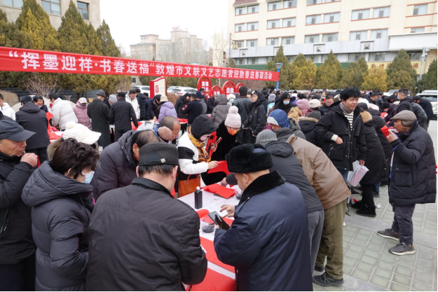 新时代文明实践中心联合市文联组织百余名书法志愿者深入新时代文明实践所站、各单位开展“挥墨迎祥书春送福”实践活动60余场次,用汉简书法书写嵌有敦煌诗词的春联1200余副、“福”字800余个。联合博物馆在市政广场、各镇文化广场开展“灵蛇献瑞—蛇年生肖文物图片特展”,让居民群众提前感受到浓浓的年味。