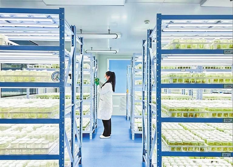 甘肃农垦亚盛农业研究院工作人员在查看试管苗生长情况。