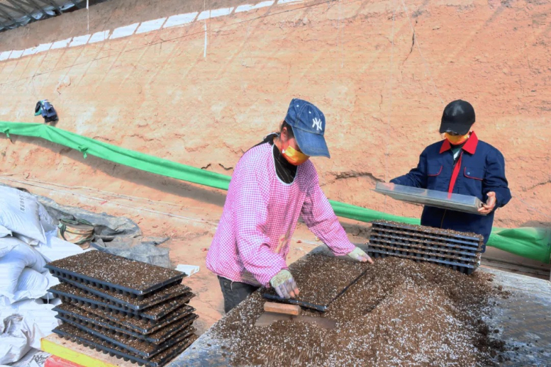 2月17日,在双湾镇许家沟村2号育苗大棚内,记者看到工人正在进行培土、装盘、点种、覆土、摆盘等育苗工作,部分区域完成了育苗流程,已经长出了嫩绿的幼苗。