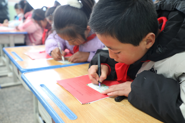 2月24日,元古堆小学小朋友们在开学第一课上填写”节约每度电,我要……“小卡片,完成“一度电的承诺”