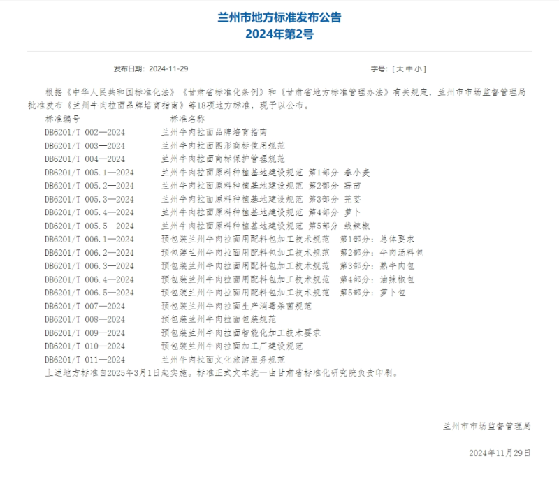 兰州市市场监管局积极服务兰州牛肉拉面行业健康发展,着力守护人民群众舌尖上的安全,批准发布《兰州牛肉拉面品牌培育指南》等18项地方标准,于2025年3月1日起实施,督促经营主体切实扛牢食品安全主体责任,全力推进兰州牛肉拉面餐饮行业高标准高质量发展。