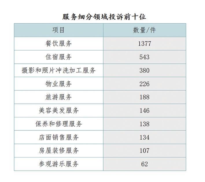 在具体服务投诉中,投诉量居前十位的分别为:餐饮服务、住宿服务、摄影和照片冲洗加工服务等。(如表所示)