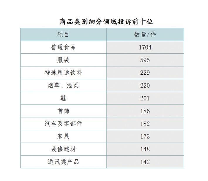 在具体商品投诉中,投诉量居前十位的分别为:普通食品、服装、特殊用途饮料等。(如表所示)